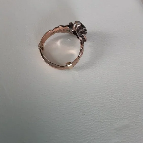 Gorgeous antique Victorian Garnet ring surrounded by 8 seed pearls. Pearls on top and bottom of ring are individually prong set and slightly larger than side pearls. The shoulder of the band is adorned in lovely, intricate engraving. It is a size 6 and currently has a ring guard which can be removed to adjust a half size if needed. Initials that appear to read "JAN" are inscribed in ring (perhaps since garnet is the gemstone for January!).Excellent condition, and a truly beautiful delicate antique piece.