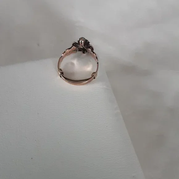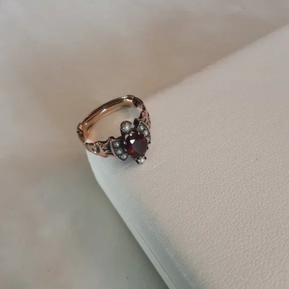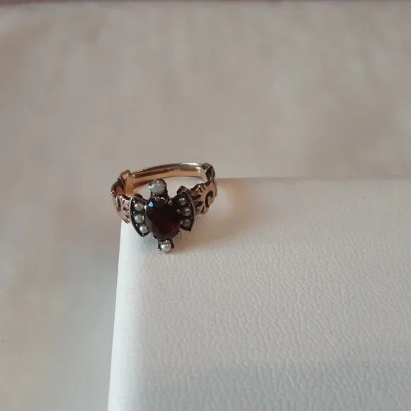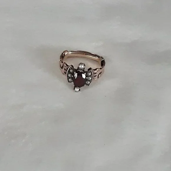 Gorgeous antique Victorian Garnet ring surrounded by 8 seed pearls. Pearls on top and bottom of ring are individually prong set and slightly larger than side pearls. The shoulder...
