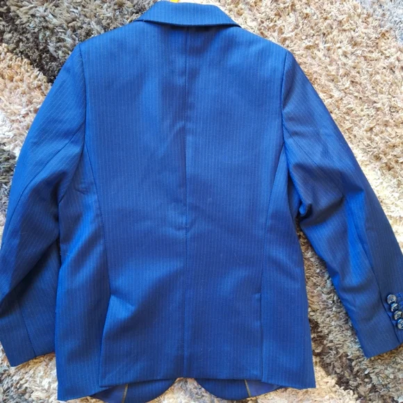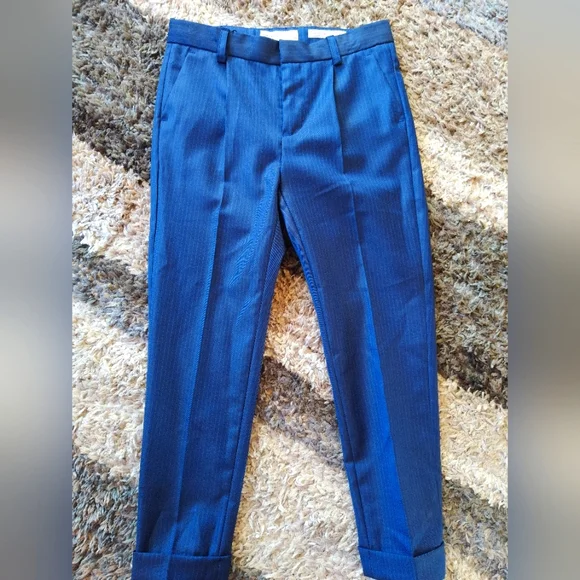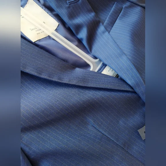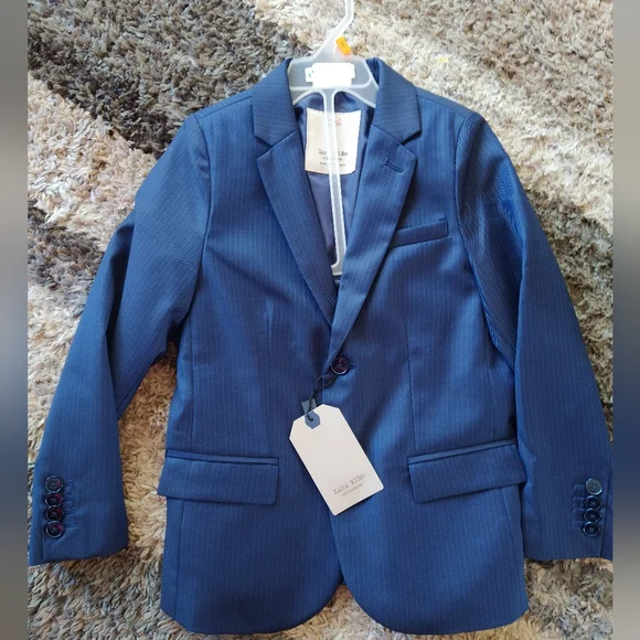 Tag Size: 7 Brand: Zara Boys Condition: New With Tags Material: 60% wool 40% poly Color: Navy pinstripe Stunning tailored fit extra fine wool navy pinstripe suit includes suit jacket and pants. Jacket with lapel collar and long sleeves and features front button closure and front flap pockets.Pants have adjustable interior waistband and front button closure, zip fly and side pockets.