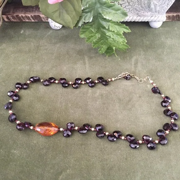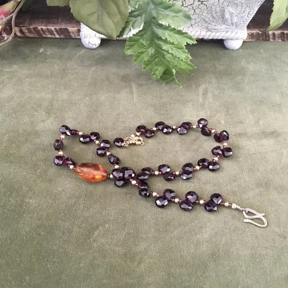 This vintage necklace of faceted garnets is centered with a topaz/amber stone. The necklace is by Elizabeth Showers.It has an s-shaped gold tone hook closure.The center stone is approximately 1" long,and the necklace measures 17".