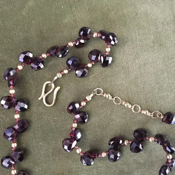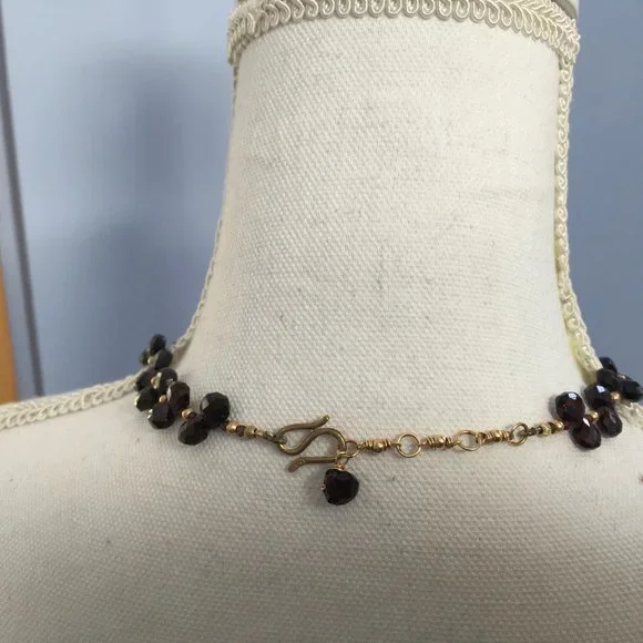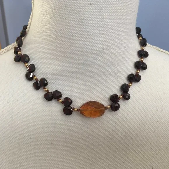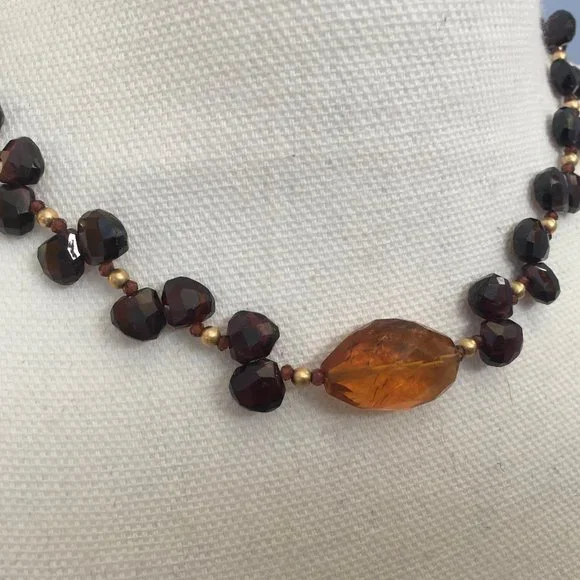 This vintage necklace of faceted garnets is centered with a topaz/amber stone. The necklace is by Elizabeth Showers.It has an s-shaped gold tone hook closure.The center stone is...