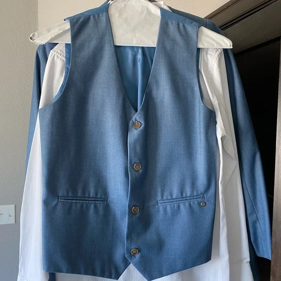 Chambray Blue suits includes pants, vest, white button up shirt, and jacket.
