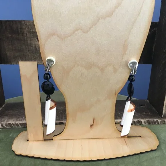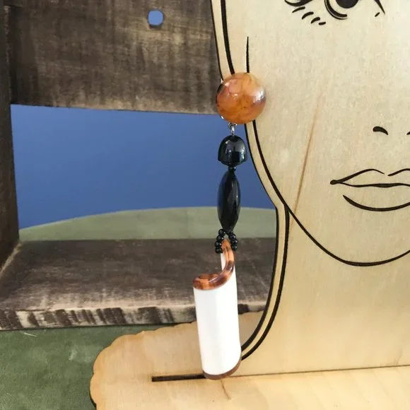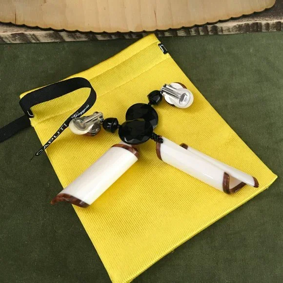 This pair of new never worn clip earrings from Angela Caputi are an Ivory colored resin highlighted in a tortoise shade.The tops are an amber colored piece.In between there are black faceted pieces.The measurements are approximatelyOverall:5"Top amber piece:3/4" diameterCream piece:3"Black pieces:7/8" diameter