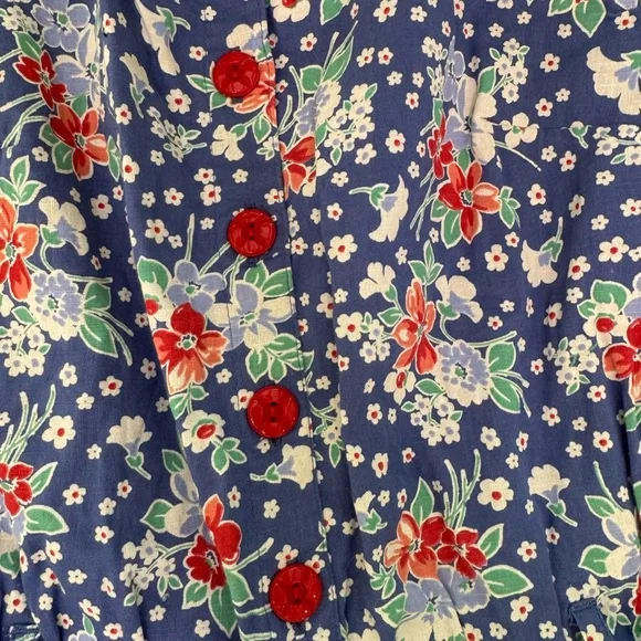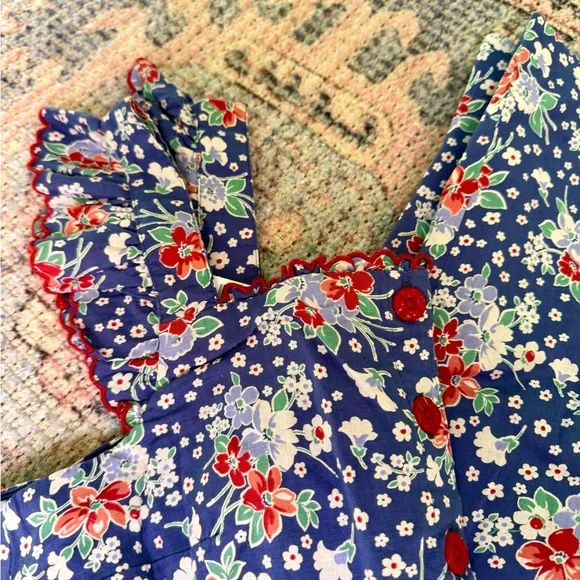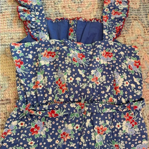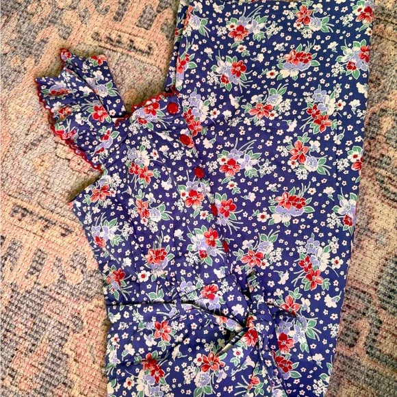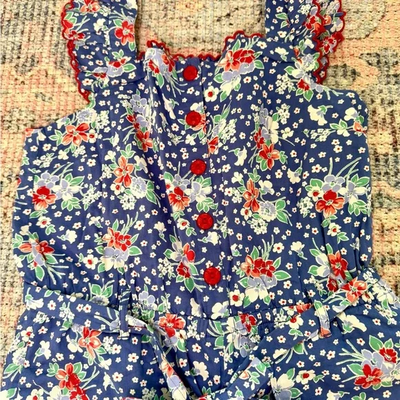 Brand new with tags floral cotton jumpsuit, sleeveless with frill straps and red accent trim and buttons, wide legs, elastic waistband.