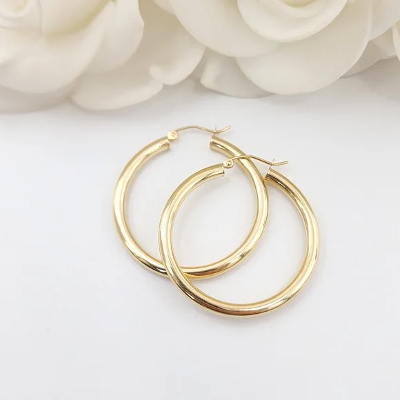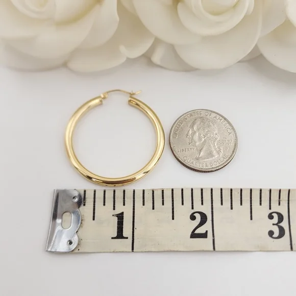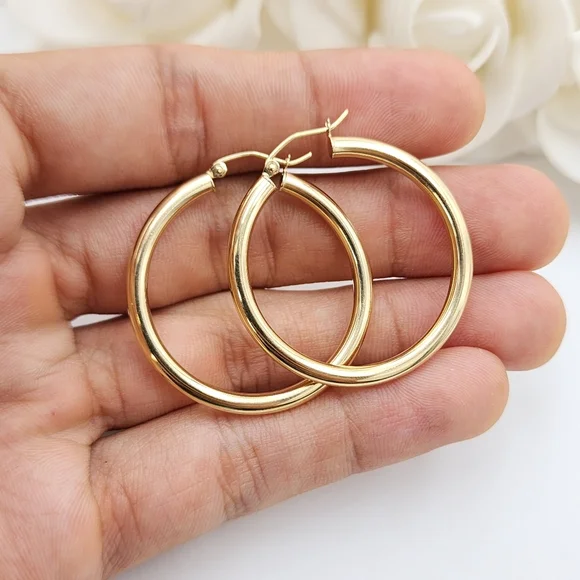 Stunning classic real 14k Gold 3MM think hoop earrings. Perfect for everyday and every occasion. Elegant, versatile, and everlasting. Thick but lightweight, very comfortable to the earlobe. 14k Gold will not tarnish or rust. Perfect gift for her.Materials: 14k GoldDiameter & Weights:35MM -2.5 gramsThickness: 3MM14k stamped Brand newFast shippingFollow us for more fine 14k Gold Jewelry for fair prices ✨️