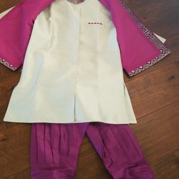 Purple n grey combo,wear as 2 in 1, elastic band purple bottom. Grey long sleeve top n heavy purple sleeve less coat...