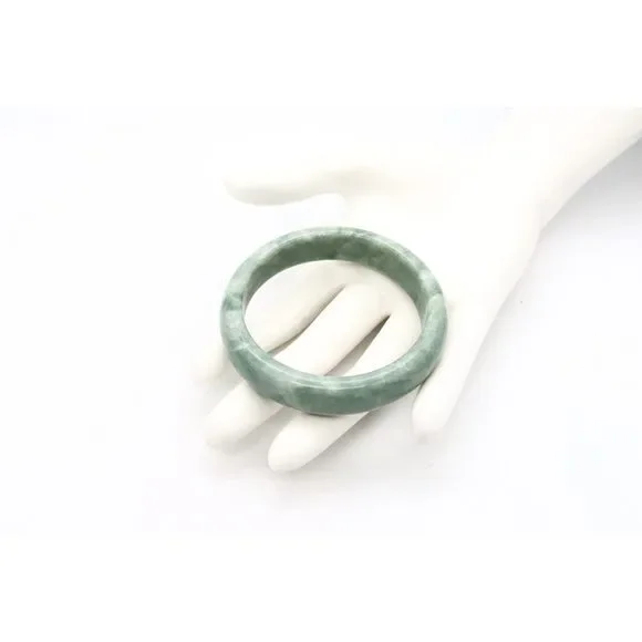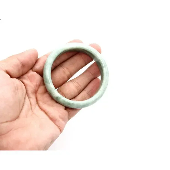 CARVED ROUND BANGLE IN MOTTED GREEN JADEITE JADE.LOVELY ANTIQUE CHINESE PIECE, CIRCA 1920´S. HAND CARVED WITH A VERY SMOOTH SURFACE IN A SIMPLE HALF ROUNDED SHAPE FROM NATURAL MOTTED JADEITE LIGHT GREEN JADE.HAVE A TOTAL WEIGHT OF 59.5 Grams AND FIT A WRIST UP TO 6.5 Inches (17 Cm). THE THICKNESS IS 15 mm (0.59 Inch).THIS JADEITE CARVING HAVE AN EVEN MOTTED COLOR, IS NOT DYED AND IS IN PERFECT CONDITION.INVENTORY REF: B0000EN/.1111