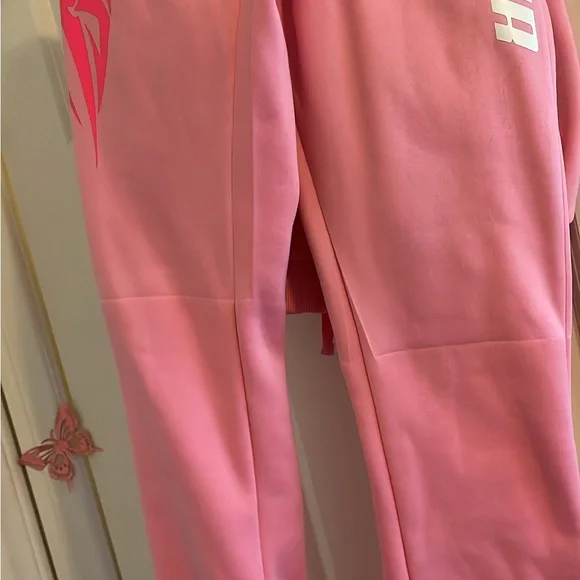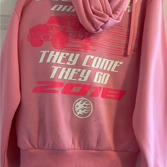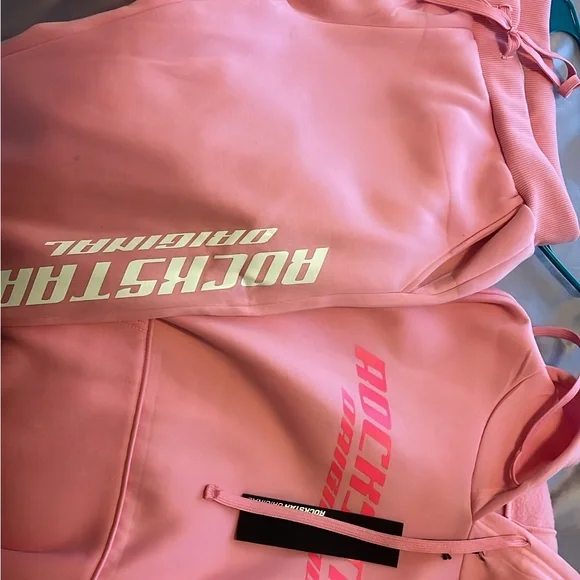 Vibrant pink sweatshirt with Rockstar graphics. Features a front pocket and ribbed cuffs. Size medium in adults