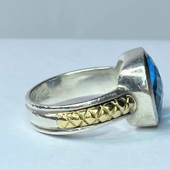 One gorgeous 18K/sterling silver 925 ring. Featuring a faceted natural Swiss Topaz bezel set atop, the gemstone is 12.4 x 13.2mm. Plaid etching in 18K yellow gold on both shank on...