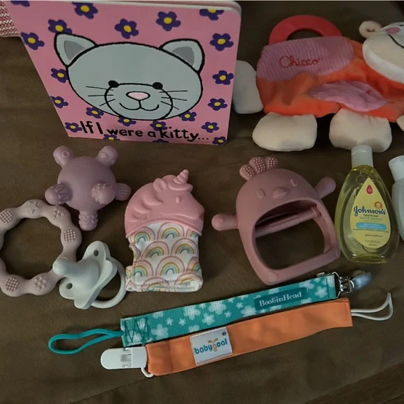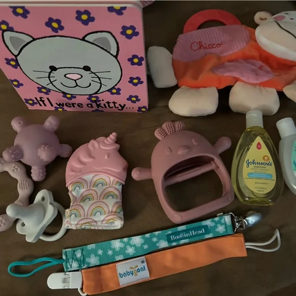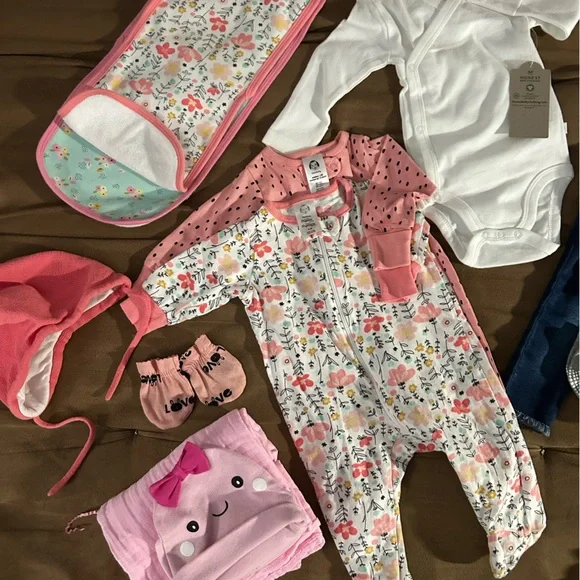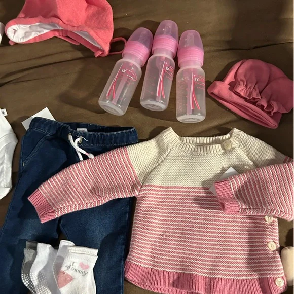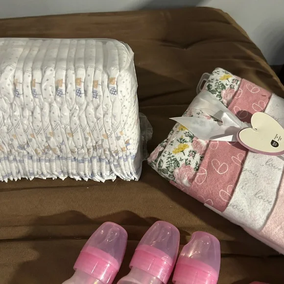 Adorable newborn baby girl gift basket . Filled with all brand new clothing and accessories. Items include 1 Baby gap sweater1 cat and jack jeans 2 sleepwear2 burp cloths 1 book3 pairs of Sox1 carters slippers1 pack pampers swaddles (newborn) 1 Hannah Anderson winter hat2hats with matching hand mittens4 teething soothers4 pack of parents choice receiving blankets1 long sleeve Honest onesie 2 Pacifier clips1 Dr.Browns pacifier 3 Dr.Brown bottles2 Johnson and ’s shampoo n body wash1 cow scrunchie toy
