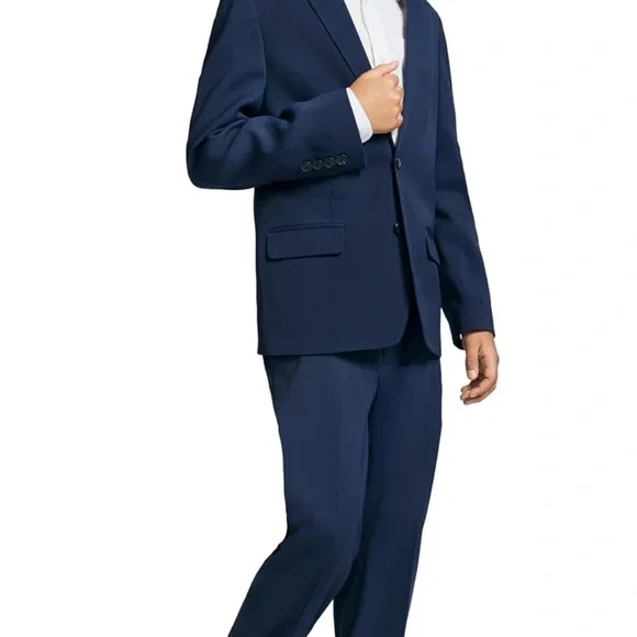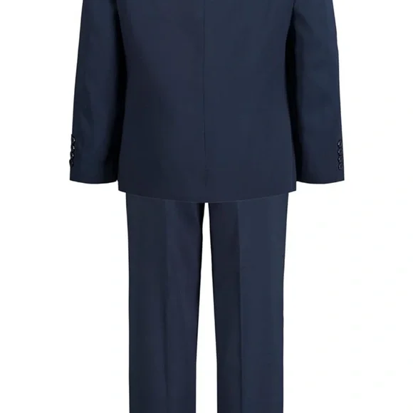 96% Polyester, 4% Spandex* Jacket: notch collar/lapel, 2-button close, 1 welt pocket, 2 flap pockets, 4-button cuffs* Pants: Button/zip close, creased frontSize 14H