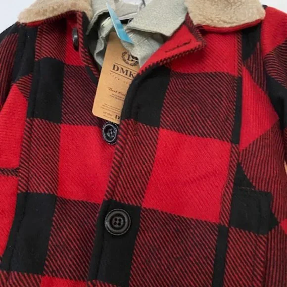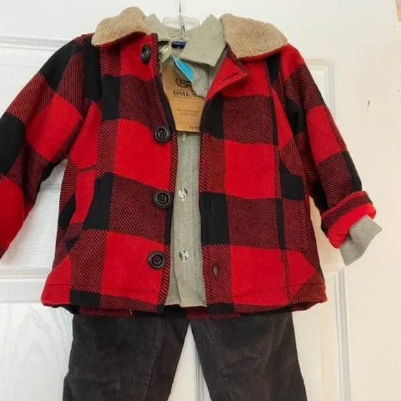 Adorableplaid jacket,pants, and shirt set for boys. Warm jacketwith a fur collar, on buttons withpockets.100% cotton .Velvet pants with 4 pockets and belt.Very cute and unique...