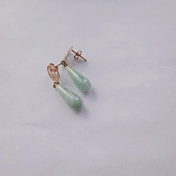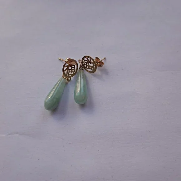 14K Gold Chinese Green Jade & Chinese OrientalSymbol Tear Drop Dangle Earrings