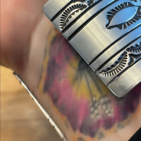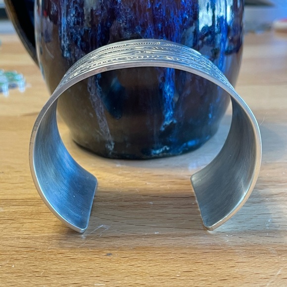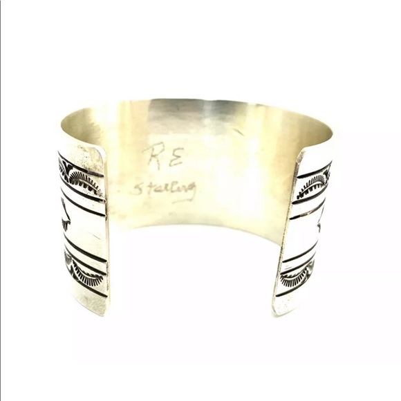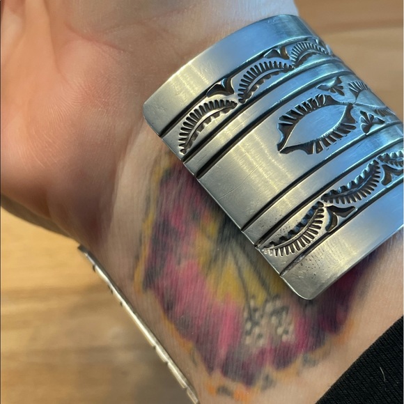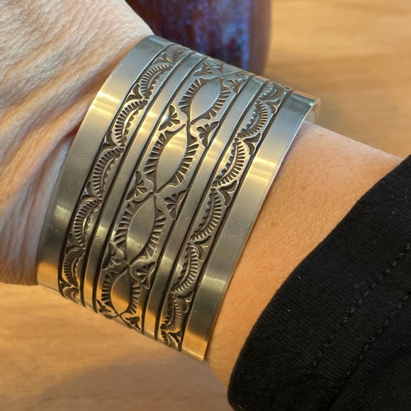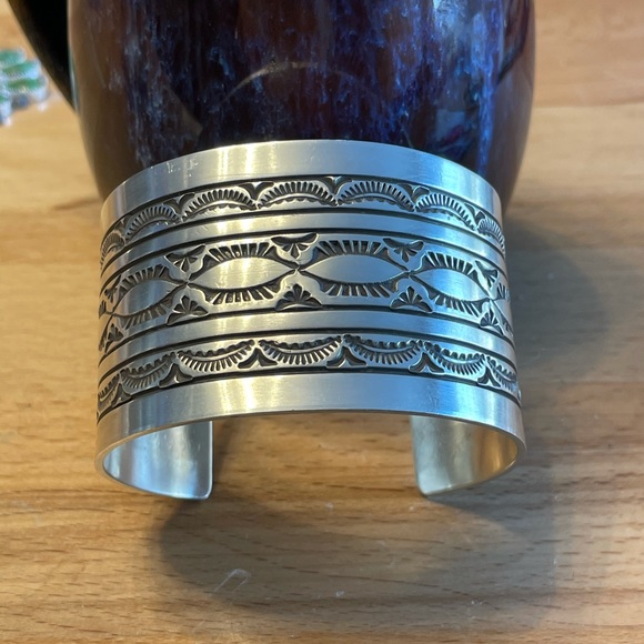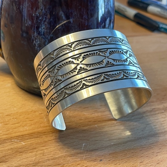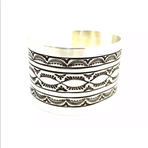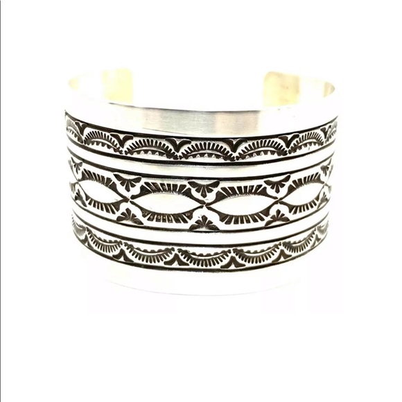 Gorgeous, Native American Sterling Silver Navajo handmade ingot cuff bracelet with beautiful stamp-work anddetails Made by Navajo artist: Rick EnricoWeight : 96 grams Size:...