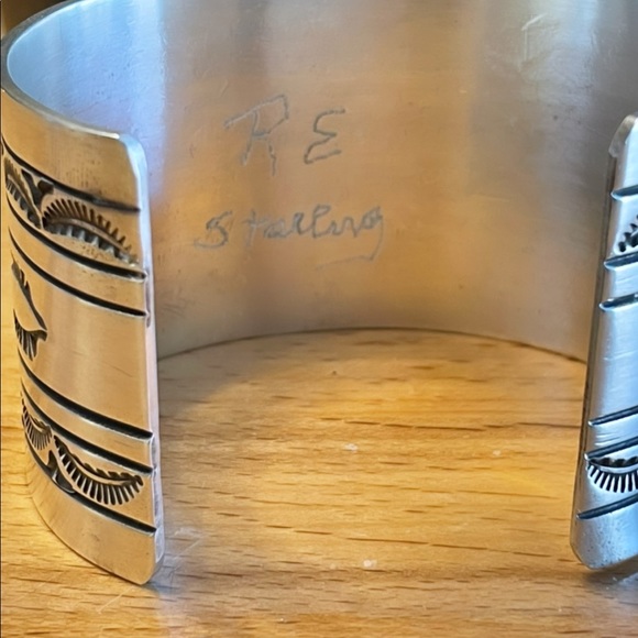 Gorgeous, Native American Sterling Silver Navajo handmade ingot cuff bracelet with beautiful stamp-work anddetails Made by Navajo artist: Rick EnricoWeight : 96 grams Size: 5.3/4” end to end from inside plus 1 1/2” opening gap Width of the bracelet : 1 3/4”Adjustable FitSigned