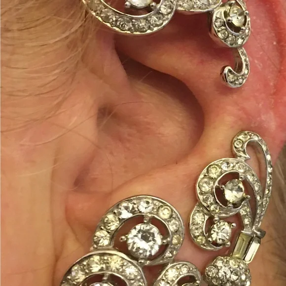 Stunningly beautiful and rare, these silver metal and clear rhinestone ear wraps make an elegant statement. Not signed but very well constructed with high quality materials. The intensive clusters of round and baguette rhinestones is a rare , one-of-a-kind design. Absolutely gorgeous in person.In fantastic vintage condition. From COVID and smoke free home. Please see my many other listings. In El Cajon off the 8 East near the Greenfield exit zip code 92021.