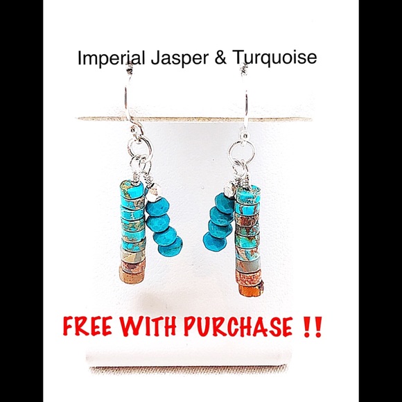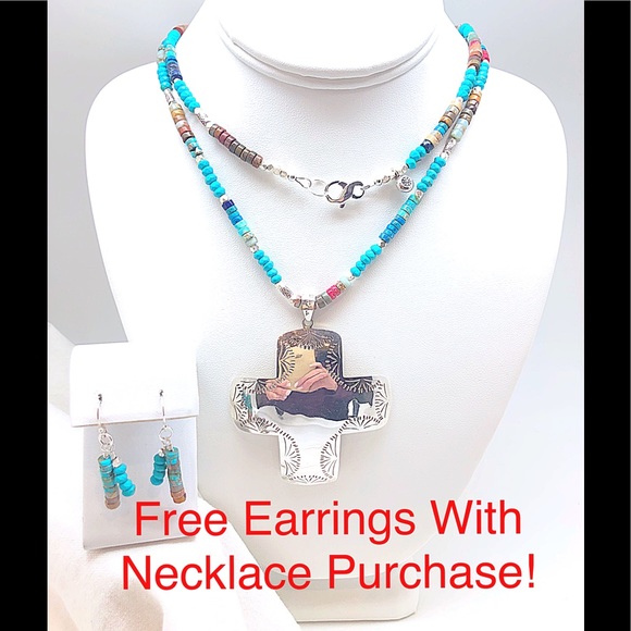 Vintage Cross (circa 1960-70) in Sterling Silver with hand beaded Turquoise and Imperial Jasper Rondelles with Karen Hill Tribe .999 beads and charm tag.Features a large sterling silver infinity design clasp. Stamped .925 Mexico. Meant to be worn doubled up for a more dramatic effect.Cross measures 3” long x 2 3/8” wide. Length of bead chain 36”.Little matching earrings are my gift to you with purchase of necklace.