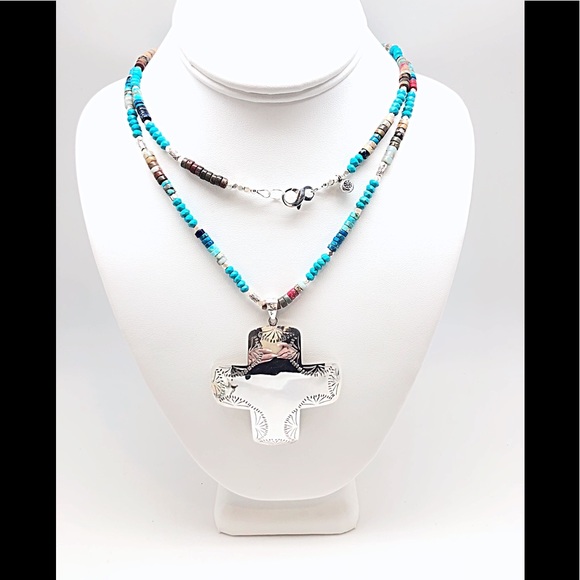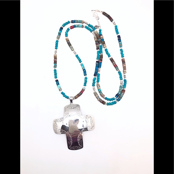 Large Vintage Sterling Navajo Style Cross Necklace on Turquoise Beaded Chain