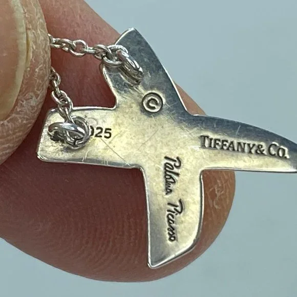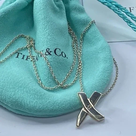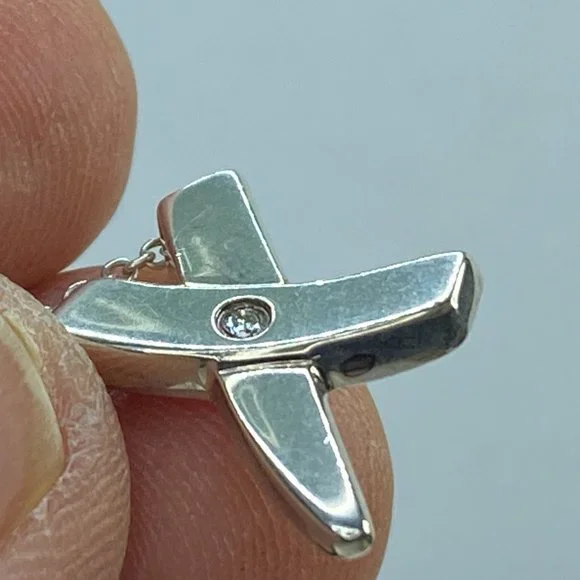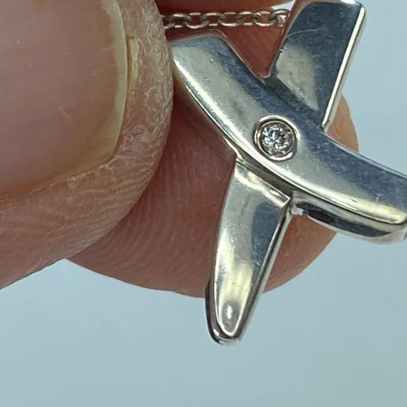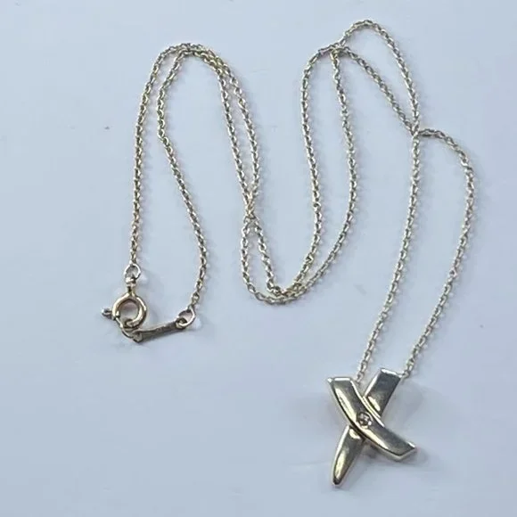 Featuring Paloma Picasso’s own handwriting, this expressive collection was inspired by graffiti scrawled on New York buildings. The universal symbol for a kiss, this X pendant is artfully graphic. Featuring pave with a small diamond in center.Sterling Silver 925Size 15.0 x 14.ommOn a 16" chainOriginal designs copyrighted by Paloma PicassoWeight 4.5gm, comes with original pouch(1 inch = 25.4 mm; 1 dime = 17.9mm).All items are pre-owned unless otherwise stated. This means they have the usual aspects of pre-owned jewelry, such as light scratches, wear and tarnish. Please review all the photos which will be part of the description. JR7423