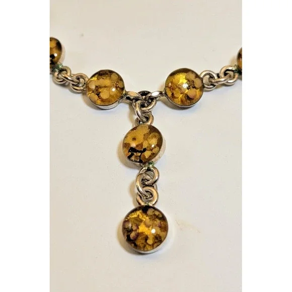 Vintage Sterling Signed Mexico Pressed Flowers In Resin Link Lavalier Necklace