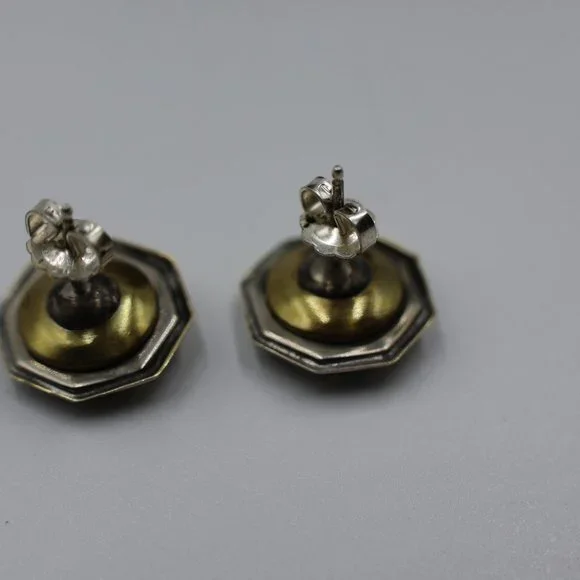 Vintage 14K White Gold and Diamond EarringsThe earring is octagonal with intricate scrolling on the face and the 8 ridged edges.There is center diamond set in a 6-sided frame.The back might be tarnished yellow gold or could be brass.The post and butterfly are sterling silver.Dimensions: diameter – just over ½”.