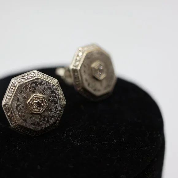 Vintage 14K White Gold and Diamond EarringsThe earring is octagonal with intricate scrolling on the face and the 8 ridged edges.There is center diamond set in a 6-sided frame.The...