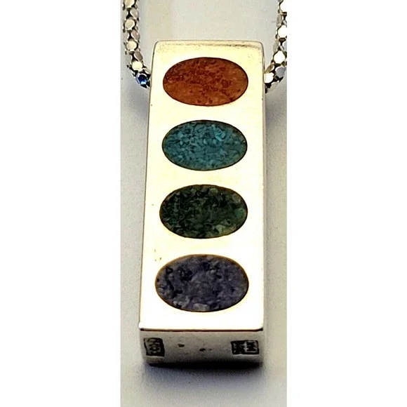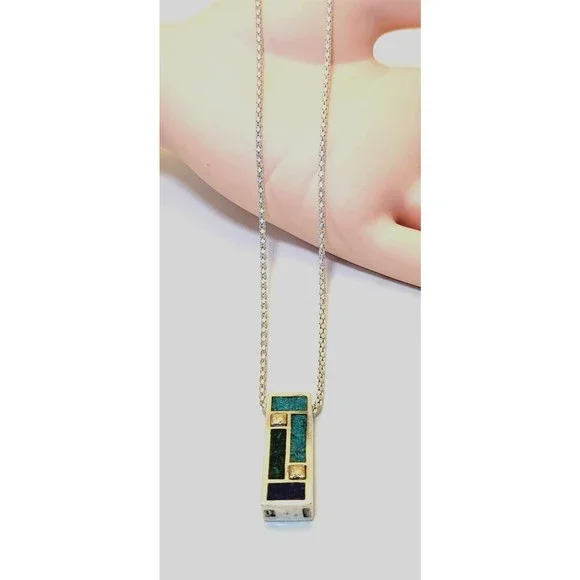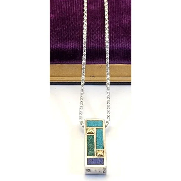 Quality Sterling 14K Double Sided Multi Gemstone Chip Inlay 14K/Turquoise/Coral/Lapis/Malachite Mosaic Pendant Is Signed CCO 925 14K. This stunningly detailed handmade heavy two sided gemstone inlay pendant was made by the Coleman Company in the 1980´s. Pendant measures 1 1/8" high X 3/8" across X 1 4" deep and weighs 20 grams, including 21" sterling hollow round popcorn style chain. I have taken pictures in different lighting to appreciate the pendants detail. Coleman Company, South Dakota is famous for its black hills gold jewelry. Please read sellers instructions and check out mystore. Most Jewelry, and other items, are vintage and will have some light wear from use, I describe all of my quality items to the best of my ability. I am not a jeweler or a gemologist, and I do the best I can on my descriptions and any flaws will be noted. I lightly clean/buff the vintage jewelry so the patina is preserved. Please ask questions before you bid, pictures are part of the item description. Display boxes and props do not come with items. Returns accepted within 3 business days of receipt, contact me the day you receive the item, and only if item has unnoticed flaws, a prompt refund will be given. Returns must be in original condition, and return shipping must include tracking information. I charge a 10% restocking fee for other returned items and return shipping is the responsibility of the buyer. I will be happy to leave feedback after positive feedback is left from buyer. Al