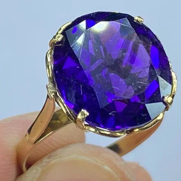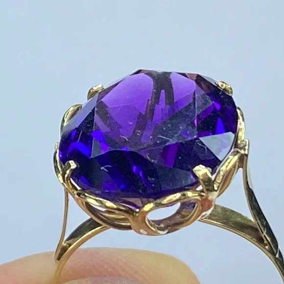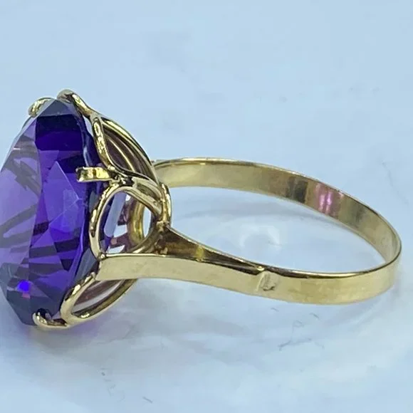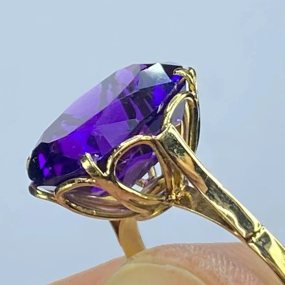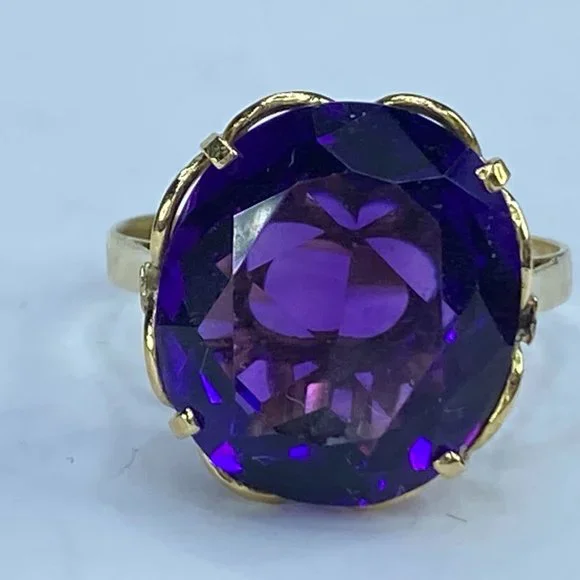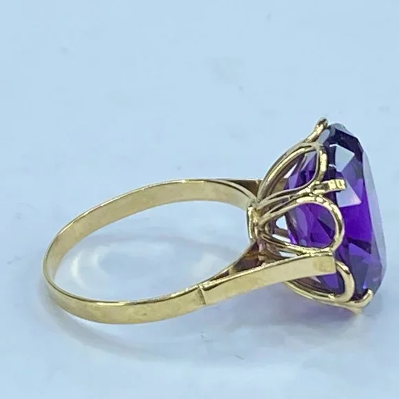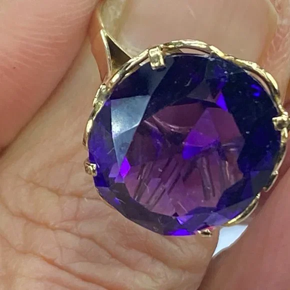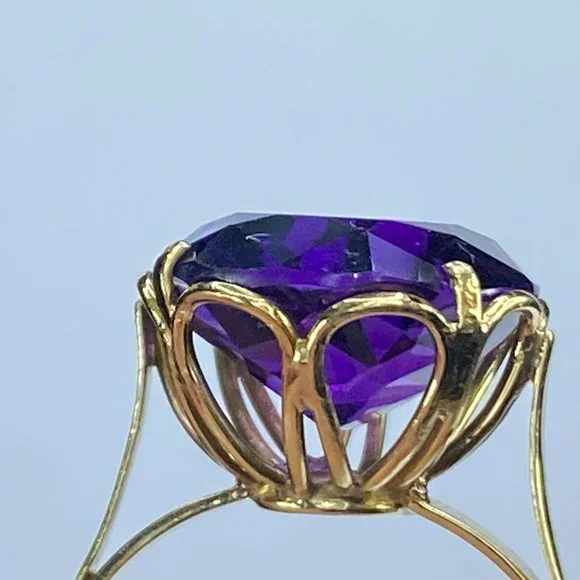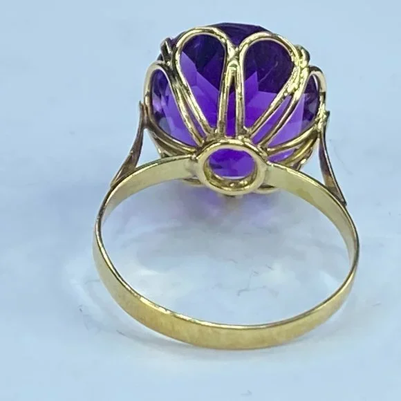 One antique 14K yellow gold ring. An oval cut faceted Amethyst gem prong setting in a floral basket ring frame. The gem is 16.2 x 14.4mm, ring size 9, weight 4.8gm, no hallmark, tested for 14K(1 inch = 25.4 mm; 1 dime = 17.9mm).All items are pre-owned unless otherwise stated. This means they have the usual aspects of pre-owned jewelry, such as light scratches, wear and tarnish. Please review all the photos which will be part of the description.