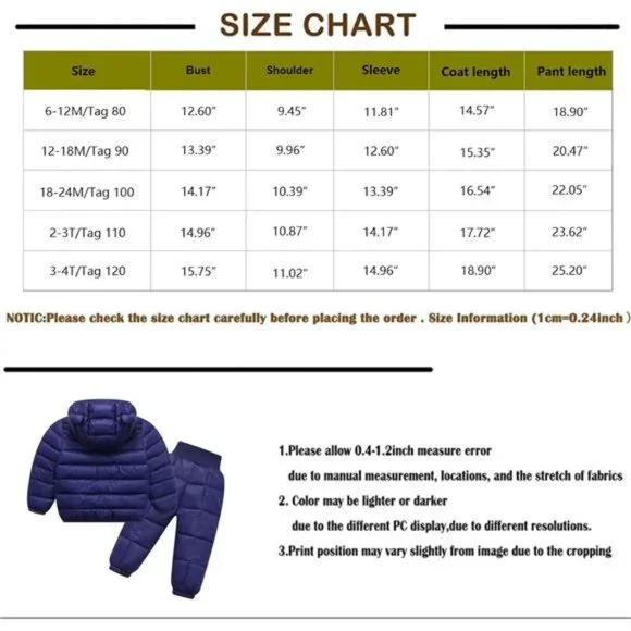 - Color: Royal Blue - High-quality Materials: Durable nylon outer fabric, high-quality filled cotton inside, lightweight, warm, and windproof, comfortable for baby wear, does not affect their activity- Reasonable design: The hooded bear ear design is warm and cute, The toddler winter coat outfit keeps the baby´s head and ears inside and warm when outing, the neckline is designed with zipper protection to protect the baby´s chin, the cuffs are designed with edging to keep warm and windproof.- Available in multiple sizes: Our padded coats for boys and girls come in 6-12 months, 12-18 months, 18- 24 months, 2 years, 3 years, and 4 years.- Please refer to the size chart for specific sizes.- Occasions: This beautiful winter fleece Outfit will be the perfect way to dress up your little baby.Suitable for casual and formal occasions like bedtime, home dress, birthdays, baby showers, and photo shoots. Perfect gift for Christmas, Halloween, Thanksgiving, party, and holiday.