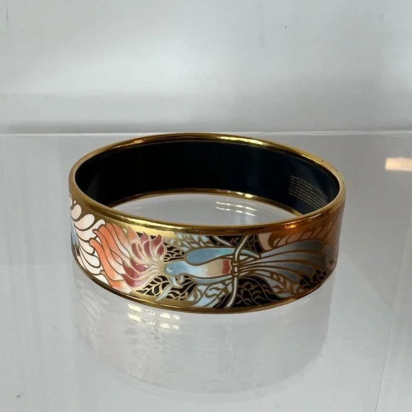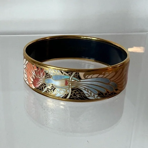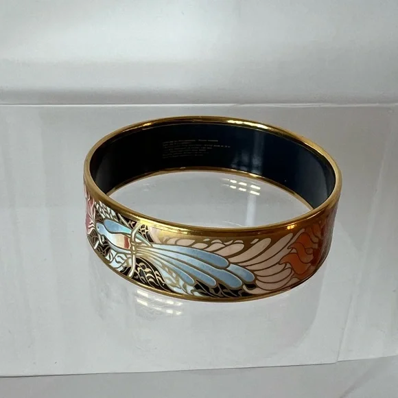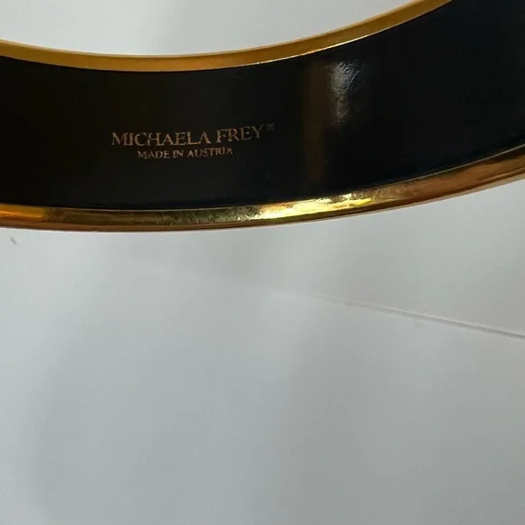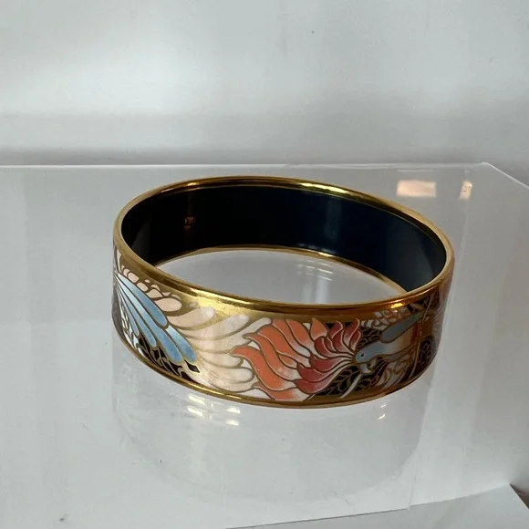 Vintage stunning, rare and unique gold Michaela Frey handmade in Austria enamel bird detail with gold trim bracelet. The inside is gold with Signature, and the coral and bluebird and flower design with a touch of gold trim. It is in great almost new condition.Frey an Austrian based jewelry artist.