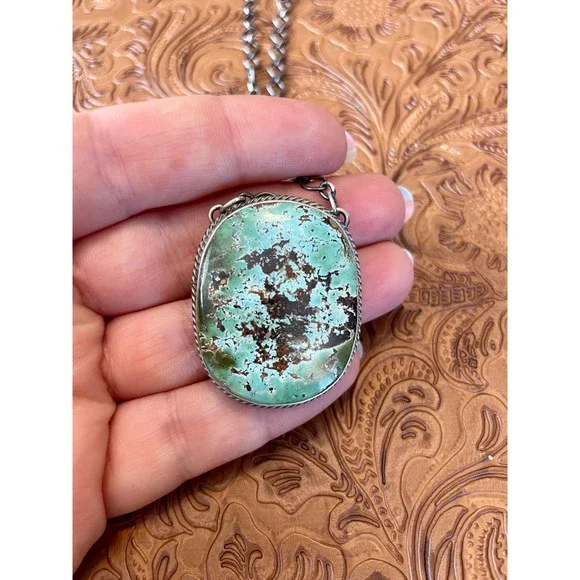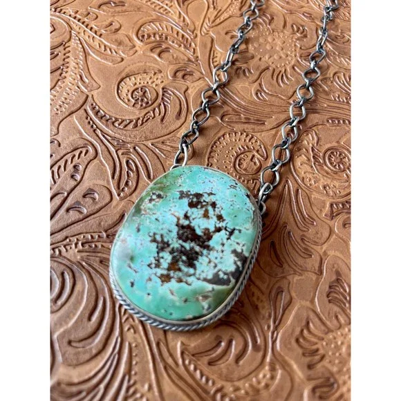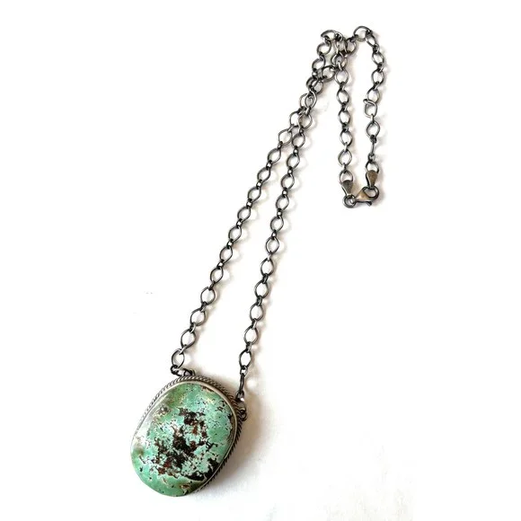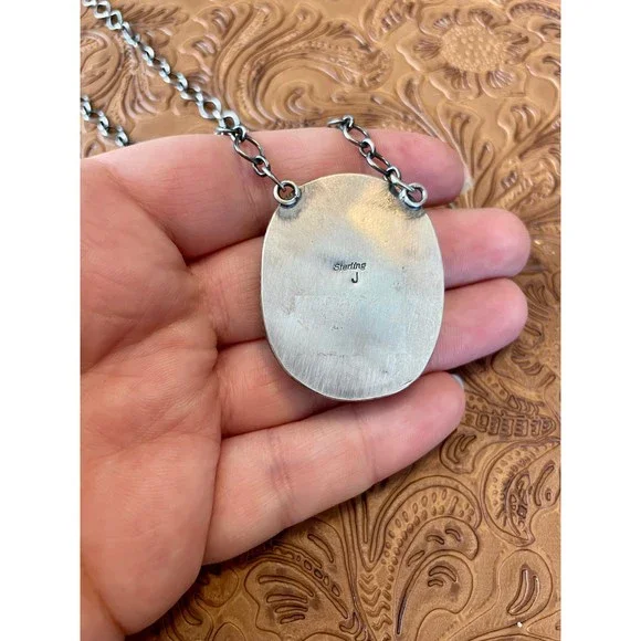 * JEWELRY TYPE : Necklaces* TRIBAL AFFILIATION : Navajo* MAIN STONE : Turquoise* METAL : Sterling Silver* SIGNED? : SignedThis is a wonderful handmade Navajo TurquoiseNecklace. The length of the necklace is 18 inches and the pendant is just over 1 1/2 inches wide and 1 1/4 of an inch tall. It is made from Sterling Silver and Turquoise. This piece is signed by the artist J and stamped Sterling.Thank you for checking out our store. Please contact us with any questions. listed 8/30/22