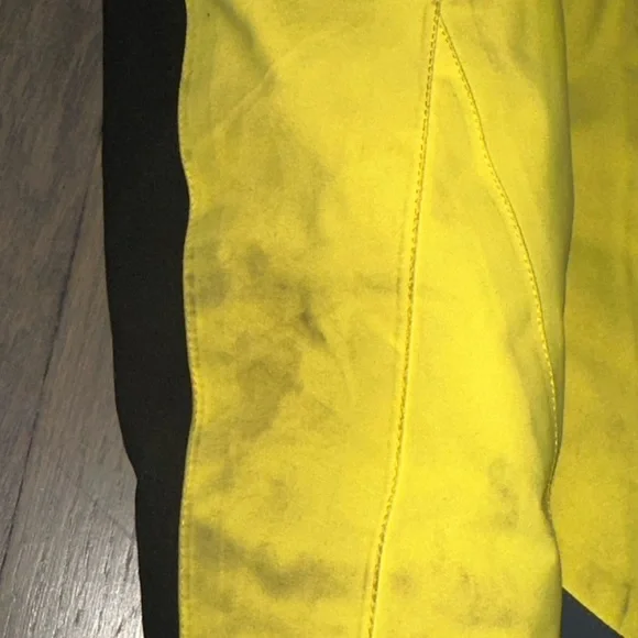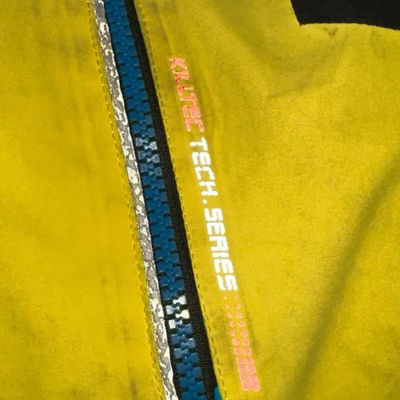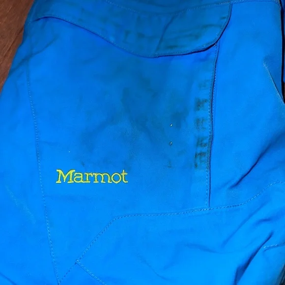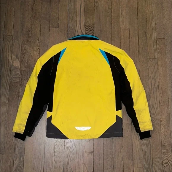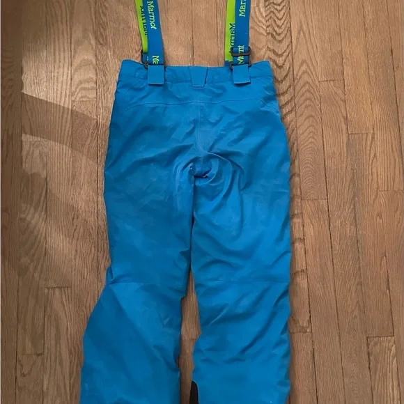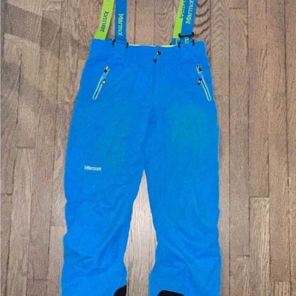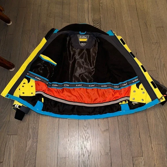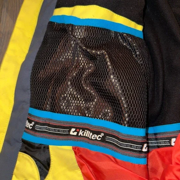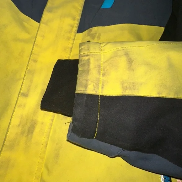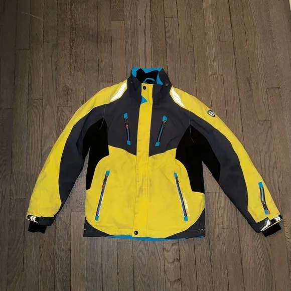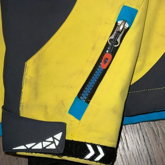 Ski set perfect for a boy age 9-12. The jacket and pants adjust in size. I love the bright colors you can spot your kid coming down the mountain!! Slight staining and wear and tear but nothing compromising its performance. Sold as a matching set.
