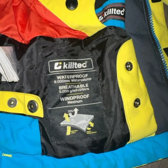 Ski set perfect for a boy age 9-12. The jacket and pants adjust in size. I love the bright colors you can spot your kid coming down the mountain!! Slight staining and wear and...
