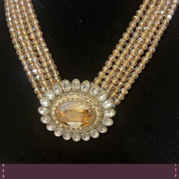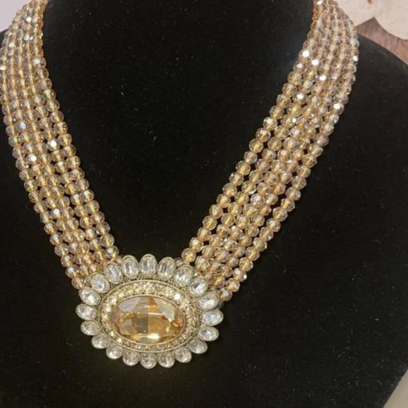Heidi Daus Dazzling Delight Crystal Beaded Necklace. Queenly Star beaded crystal necklace with a triple strand of brilliant gold, blue or brown beads escorted by a beaded pendant center that is accompanied by an extraordinary assuring turn-head effect when you walk into the ballroom with an extender 3-3/4"Heidi´s limited lifetime warranty