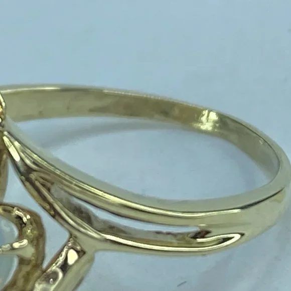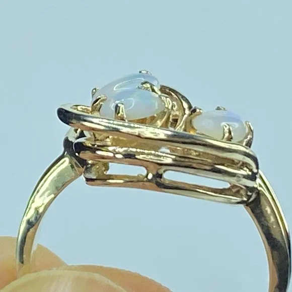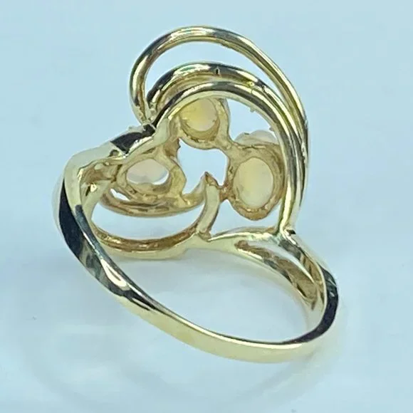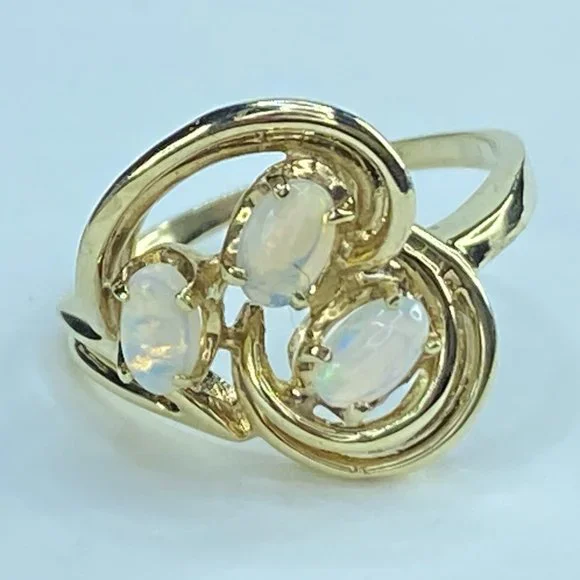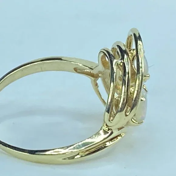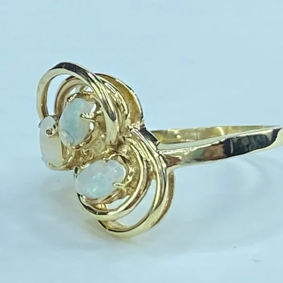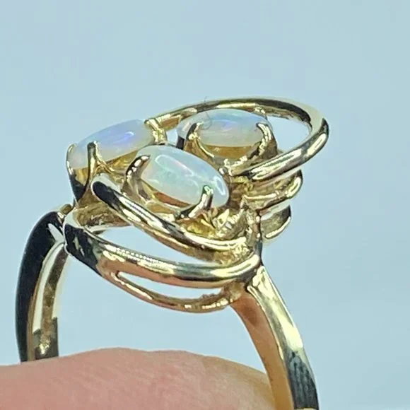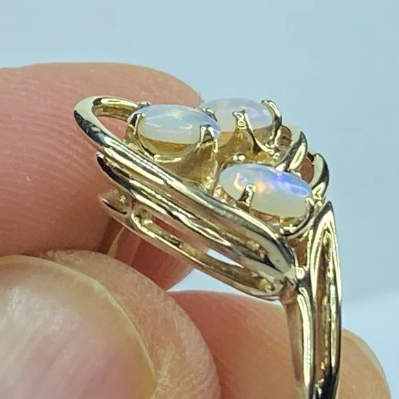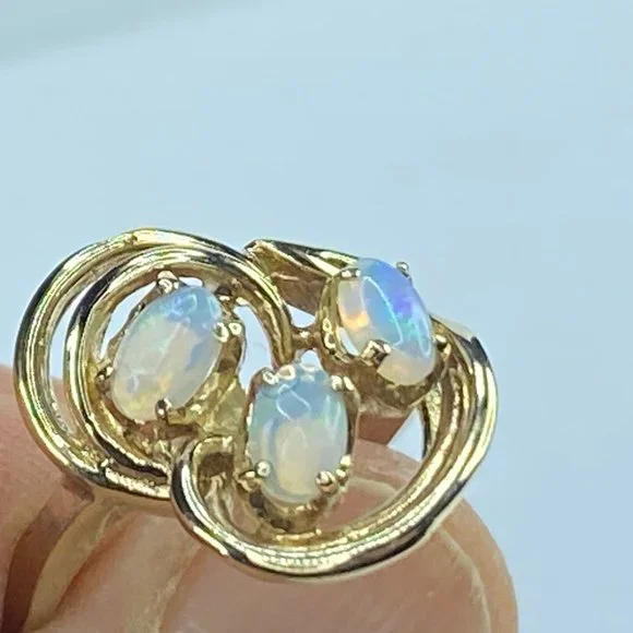 One beautiful 14K yellow gold ring, artistic abractive butterfly design, it adorns with three oval cut natural Opal, approz. 5.0 x 3.2 x 3.0mm, weight approx. 0.9ct, the opal has a lot of color and keep playing, ring top is 16.0 x 14.7mm, size 6.75, weight 2.9gm, no hallmark, tested for 14K(1 inch = 25.4 mm; 1 dime = 17.9mm).All items are pre-owned unless otherwise stated. This means they have the usual aspects of pre-owned jewelry, such as light scratches, wear and tarnish. Please review all the photos which will be part of the description.