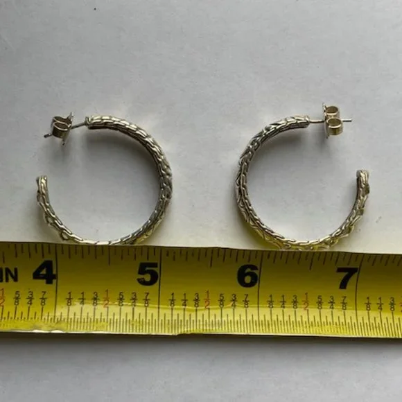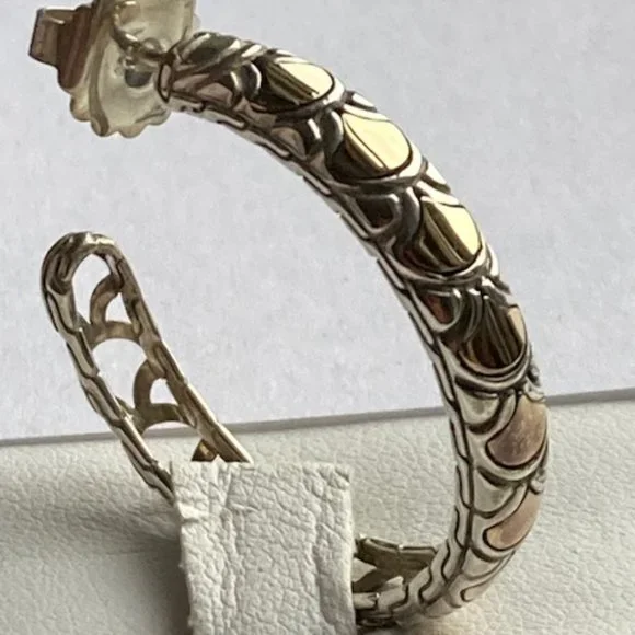 Sterling Silver with 18kt Yellow Gold accent John Hardy post style earrings. From the Naga Legends collection these barely worn earrings are approximately 1 1/2" across and a 3.4 way around hoop. Comes in the John Hardy brown velvet pouch.