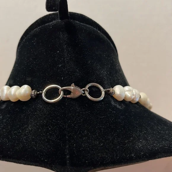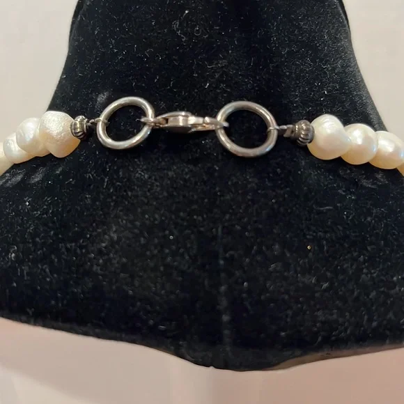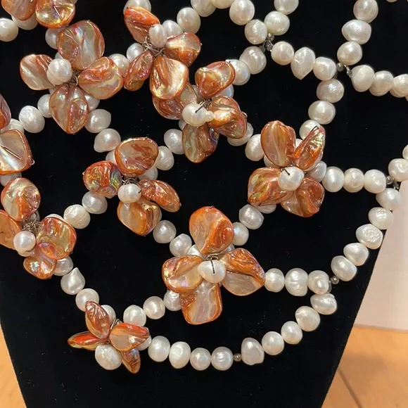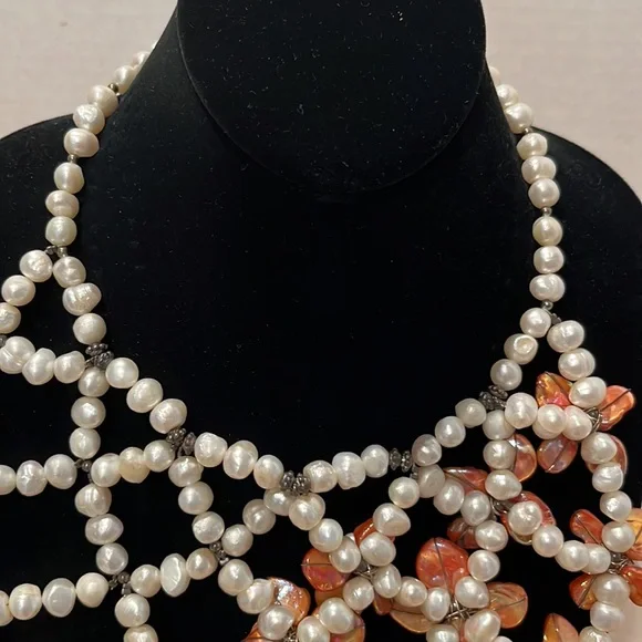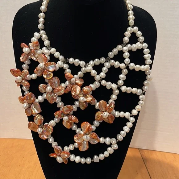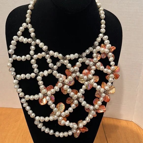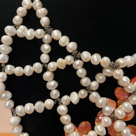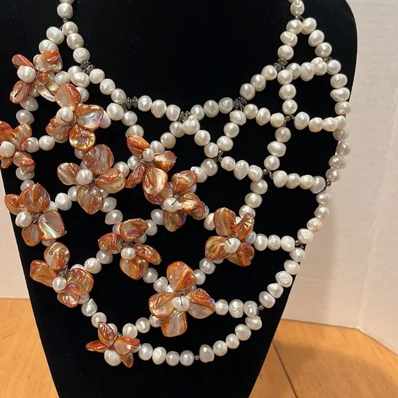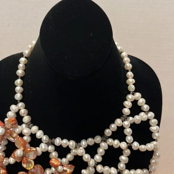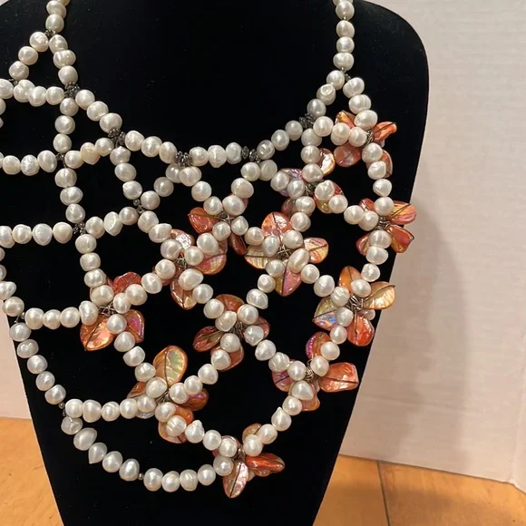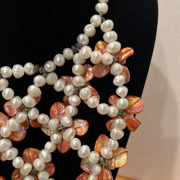 CasaBelle one of a Kind hand made pearls and abalone with dark silver hardwareDone a fashion show , new, store ticket no stamping couture runway piece intricate weaving of materials conversation necklace, collar , bib , over a strapless, bathing suit, turtle neck , dressBreathtaking Vintage newLook read ask Spectacular ShowstopperAll pearls and abalone shell flowers that shimmer like glass to the face ❤️❤️Look carefully it’s not for a big neck Drapes 10” like collar style then drops the bib around 16” total it’s for Thin neckThis can make a whole top against fabricStore tag vintage new