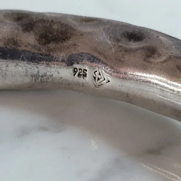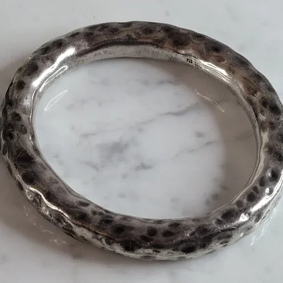 A WOMENS VINTAGE ESTATE STERLING SILVER HAND HAMMERED MODERNIST BANGLE BRACELET.BRACELETMEASURES 7 3/4" IN CIRCUMFERENCEBY 3/8" WIDE AND WEIGHS 48.2g.AS YOU CAN SEE IN THE LAST PIC THE BRACELET IS MARKED.NOT SURE WHO THE MAKER IS.THIS WOULD MAKE A LOVELY GIFT FOR THAT SOMEONE SPECIAL.ANY QUESTIONS, PLEASE DON´T HESITATE TO ASK.BE SURE TO CHECK OUT SOME OF MY OTHER GREAT ITEMS UP FOR SALE. THANK YOU.