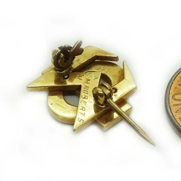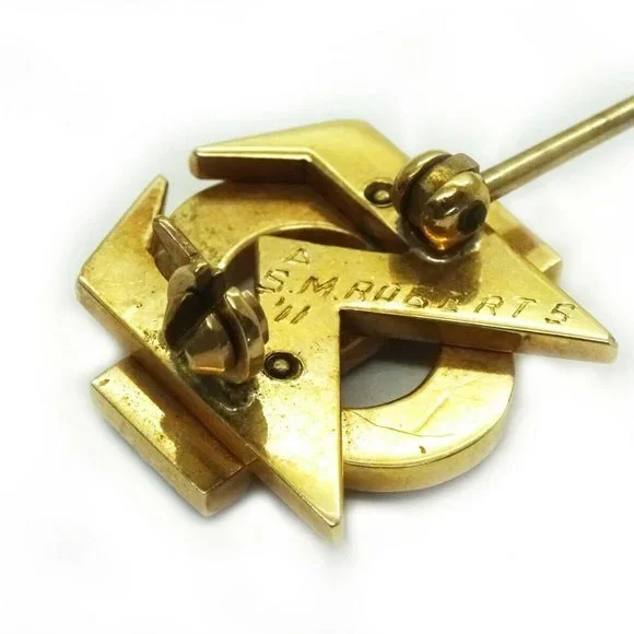 Beautiful 111 year old 14k solid yellow fraternity/sorority pin, set with genuine robin’s egg blue turquoise and seed pearls.The pin appears to read Phi Sigma.Engraved with the delta symbol and S.M. Roberts, ’11.Not marked, but tested to be 14k gold.Weighs 3.0 grams.Pin is about 14mm x 14mm.Excellent estate condition. Gently pre-owned.
