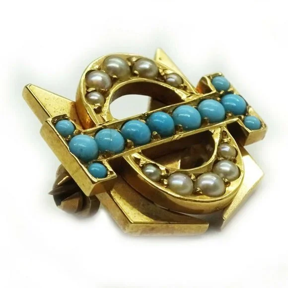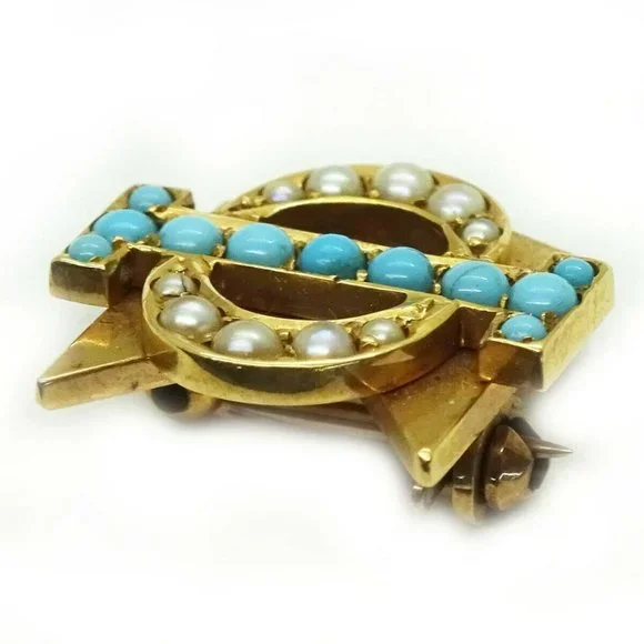 Beautiful 111 year old 14k solid yellow fraternity/sorority pin, set with genuine robin’s egg blue turquoise and seed pearls.The pin appears to read Phi Sigma.Engraved with the...