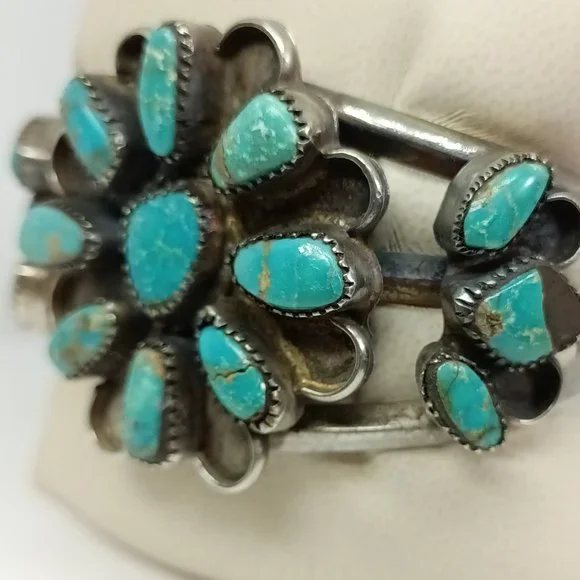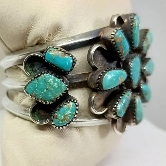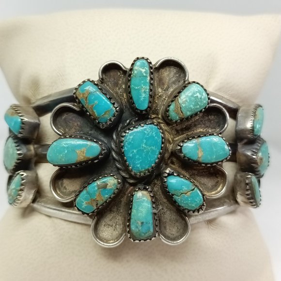 Native American Sawtooth Bezel Turquoise CuffWeighs 51.1 gramsGently pre-owned, the turquoise stone in the far right side is cracked in half (see pictures).