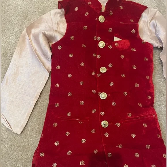 Young boys gold kurta pajama with red vest - see measurements below. Chest: 23 inches Waist: 22 inches Hips: 26.5 inches Please note this is part of a set that includes adult male, female and young girls matching outfits. Please reach out for more detail if interested.