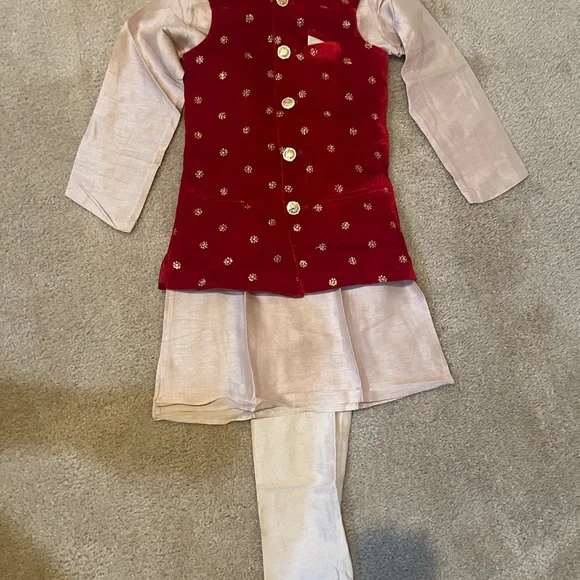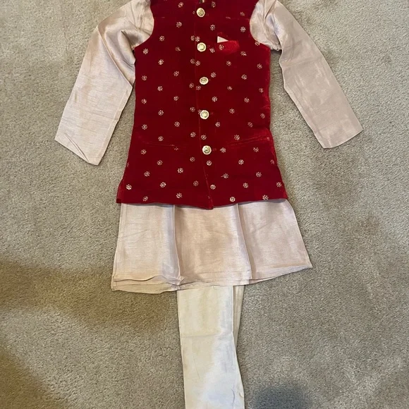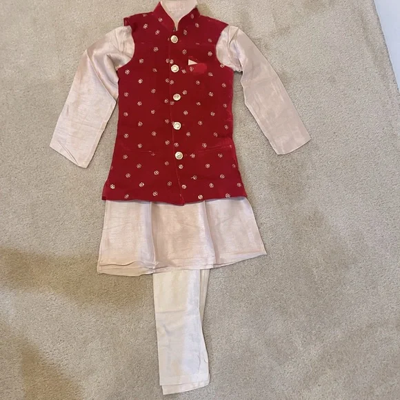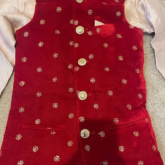 Young boys gold kurta pajama with red vest - see measurements below. Chest: 23 inches Waist: 22 inches Hips: 26.5 inches Please note this is part of a set that includes adult...