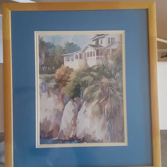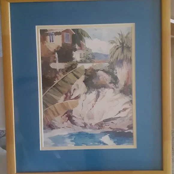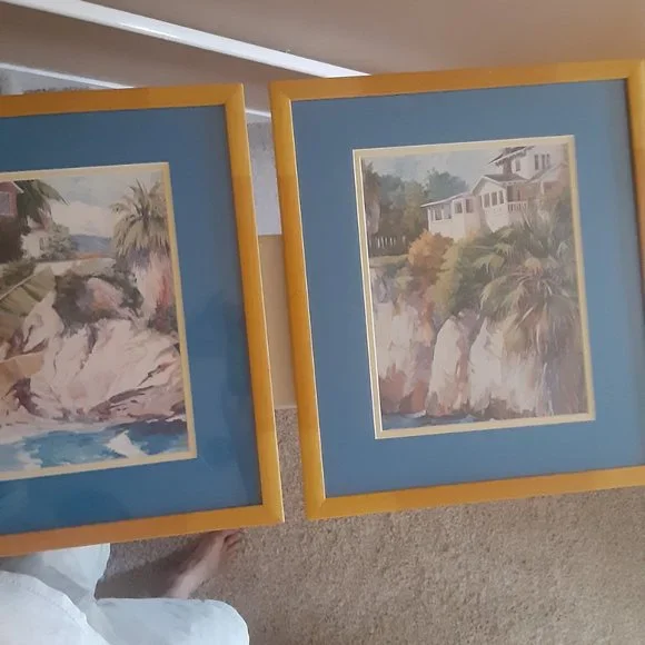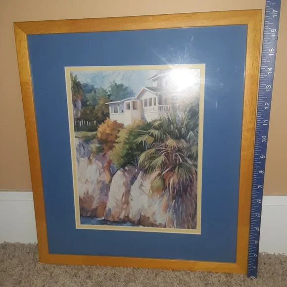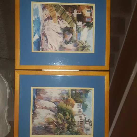 This beautiful pair of seaside paintings are framed in matching blond color wooden frames and are trimmed with a nice blue boarder.