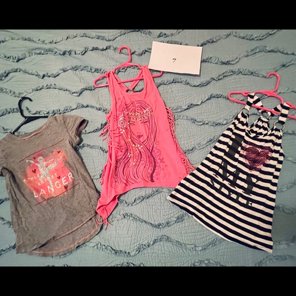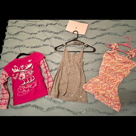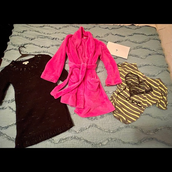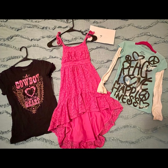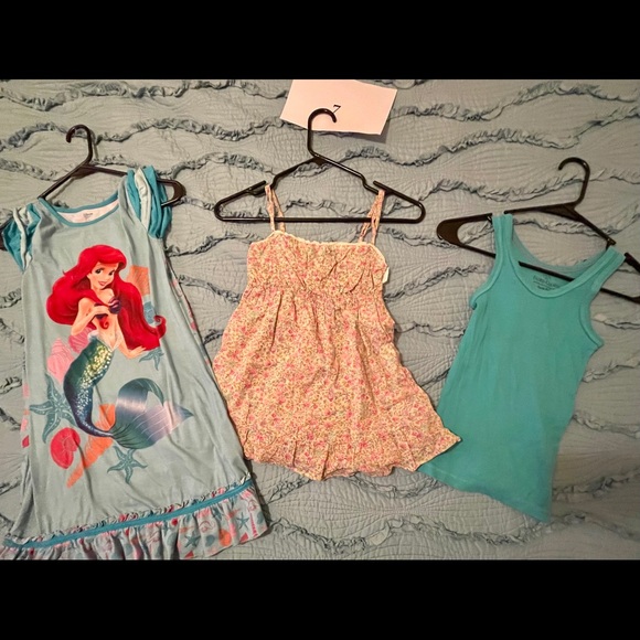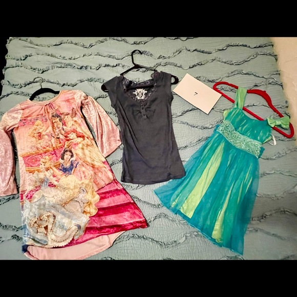 Lot 1 20 items included:pink robeNightgowns:Disney princessesDisney Ariel mermaidDresses:Cherokee fleece glitter blackMy Michelle neon green blue laceBlack dress longMimi Molly burgundyRoute 66 pink knitShirts:Lime green grey striped LoveNo boundaries navy blue lacedance glitter grey shirtMudd peace lovePink deerCMT loot cowboyTanks:Mi manchi black & white striped Route 66 pink Indian girlFaded glory blueDelia’s floralAbercrombie grey tankJustice floral romper