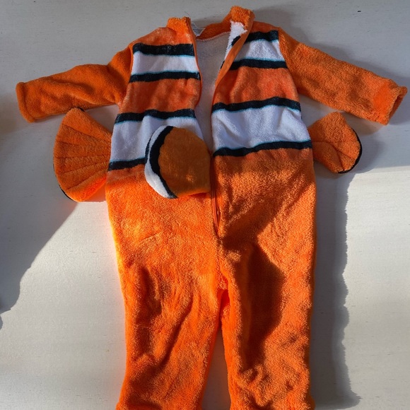Penguin outfit is 6-9 months Dog onesie is 18 months Sr.Patricks onesie is 9-12 monthsThanksgiving outfits is 9 months ONE onesie is 9-12monthsBoth Christmas outfits are 9months Finding Nemo costume is one size