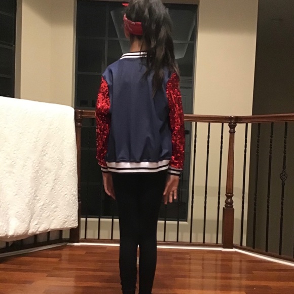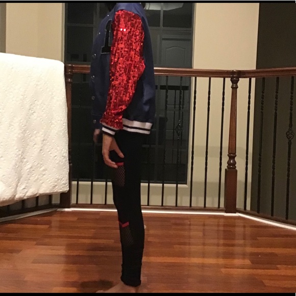 Navy blue,red, and white jacket. Black and red leggings with fishnet lacing patches. Worn once, great condition.