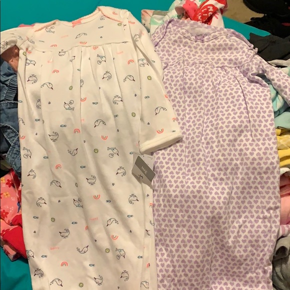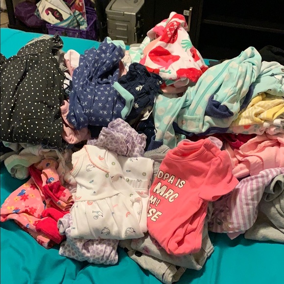(All sizes 0-3 months and 3-6 months) There are LOTS of baby girl clothes in this bag!!! I am looking to get rid of everything my baby girl can’t fit anymore. What’s in the bag has no stains, has been worn once or twice, or is new. items that’s been worn were washed with dreft laundry detergent. I am willing to negotiate I just want it gone! There’s gowns, sleepers, bodysuits, shoes, pants, shirts, and pajamas available. I KNOW ITS PRETTY SLOPPY AND THERES A LOT YOU CANT SEE I APOLOGIZE.
