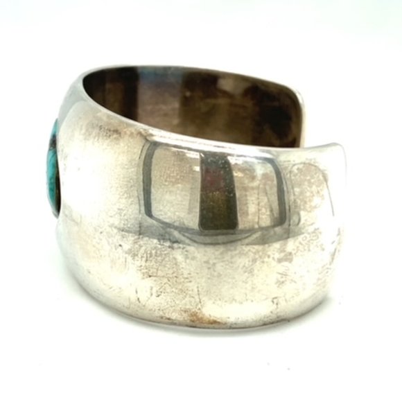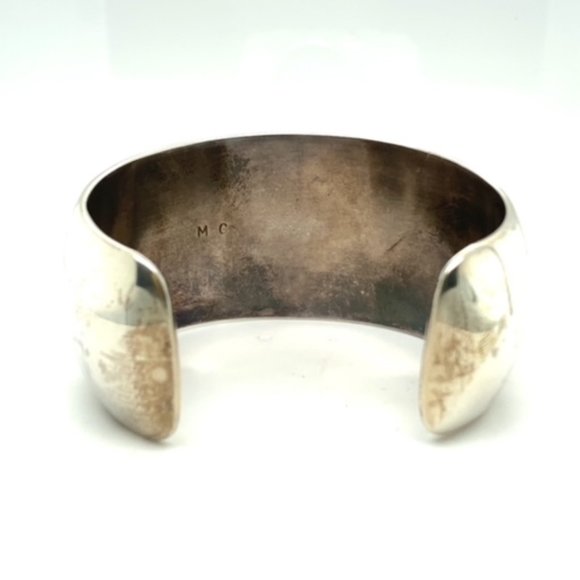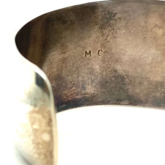 Wide slightly domed cuff in sterling silver is set with a single turquoise stone in a "shadow box" setting ( bezel set with open surrounding area with antiquing. The turquoise is in nice condition and is secure. Width of the cuff is 1 5/16 inches and tapers slightly at the ends. The inner diameter of this cuff is approximately 6 inches including a 1 1/8 inch gap. This is meant for a small woman´s wrist and has no flex to it. The weight of the cuff is 50.4 grams. Signed MC on the back.