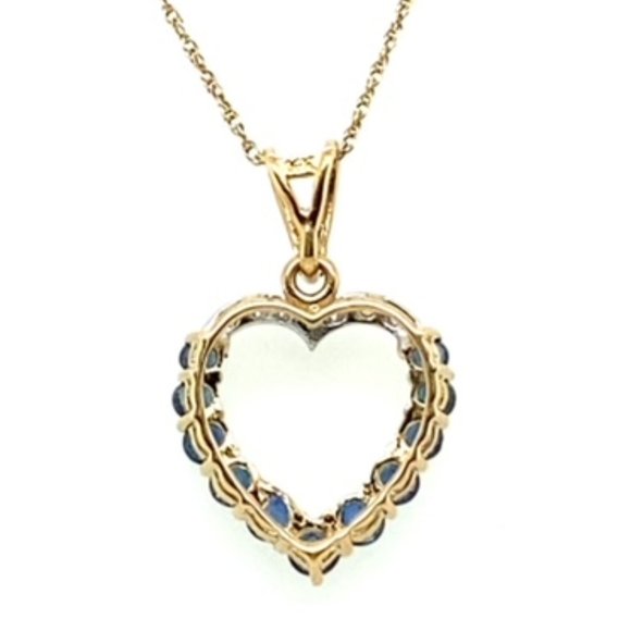 14k, yellow gold open heart set with sapphires and diamond accents. Approximately .75 of a carat in sapphires and .02 of a carat in diamonds. Length of pendant with bail is 15/16 of an inch and it comes with a lightweight, rope chain that is also in 14k, yellow gold and is 19 inches in length. Weight of the entire necklace is 2.4 grams.